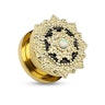 Este plug divino está decorado com detalhes banhados a ouro por toda a joia, excepto no centro da parte frontal. Aqui tem uma pequena gema esmaltada, que contrasta estupendamente com a cor dourada e preta da joia. Esta gema trata-se na realidade de uma opala, o qual para esta joia é uma maravilhosa escolha. Além disso, ao redor desta existem bonitas decorações, que como já mencionamos, são em dourado e preto.