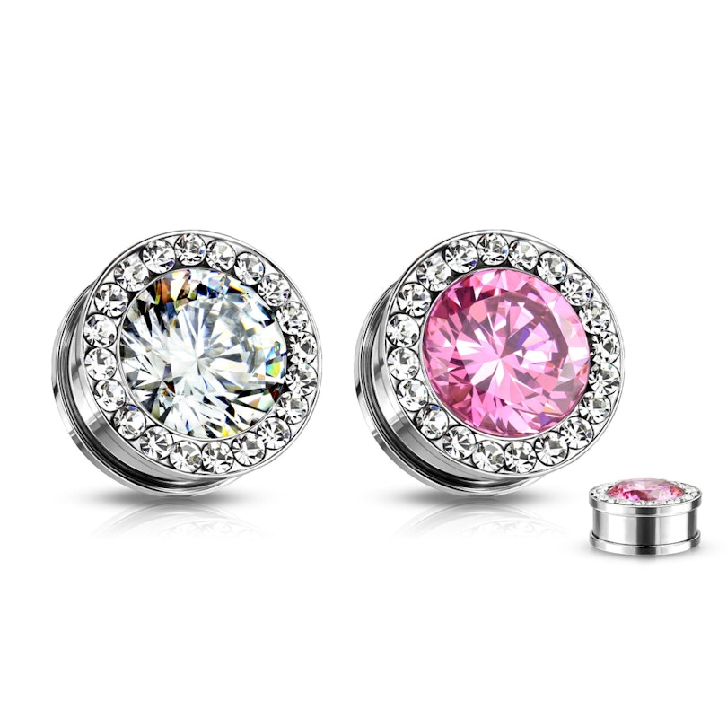 As dilatações e o efeito bling-bling têm sido uma boa combinação. Além de que os brilhantes grandes nas orelhas são cada vez mais populares. Descubra este bonito plug com um brilhante grande e muitos brilhantes pequenos ao redor nas cores mais populares, perfeito tanto para eles, como para elas.