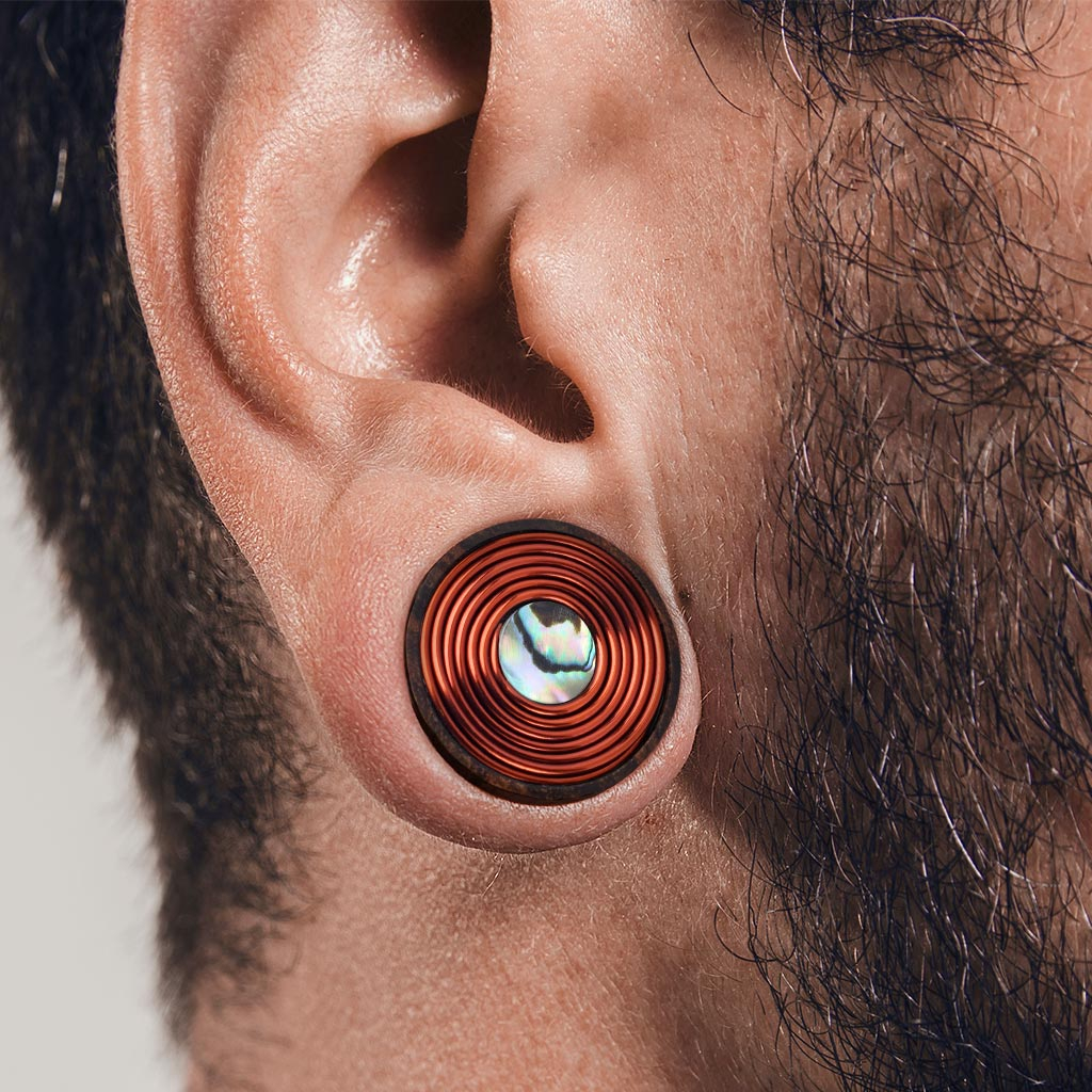 A frente da joia tem um pequeno disco de nacar no centro, este está rodeado de arame de cobre. Pode parecer um pouco estranho se nunca antes viu noutras joias, mas na realidade é muito bom para um plug.