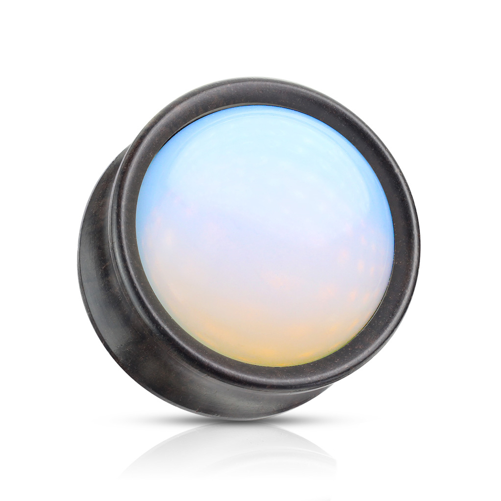 Este plug é um deleite para os olhos, porque mistura a sua cor quente da madeira com a cor leitosa da opala. Como podes ver na imagem acima, a opala tem duas tonalidade diferentes. A cor principal é o branco, mas também se revelam tons de azul, rosa e laranja, dependendo de como a luz se incide.