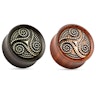 Plug realmente luxuoso, com uma quente cor vermelha da madeira de palissandro, ou em ébano escuro, que permitem que a sua dilatação possa transpirar. Este plug está decorado com o mais belo dos desenhos tribais, com o seu bonito desenho na parte frontal da joia, que sem dúvida dará um estilo sofisticado e diferente ao seu estilo. O seu bonito desenho com três espirais tem uma simetria em cada um dos pontos, e é feito numa placa de bronze, que contraste estupendamente com a cor da madeira.