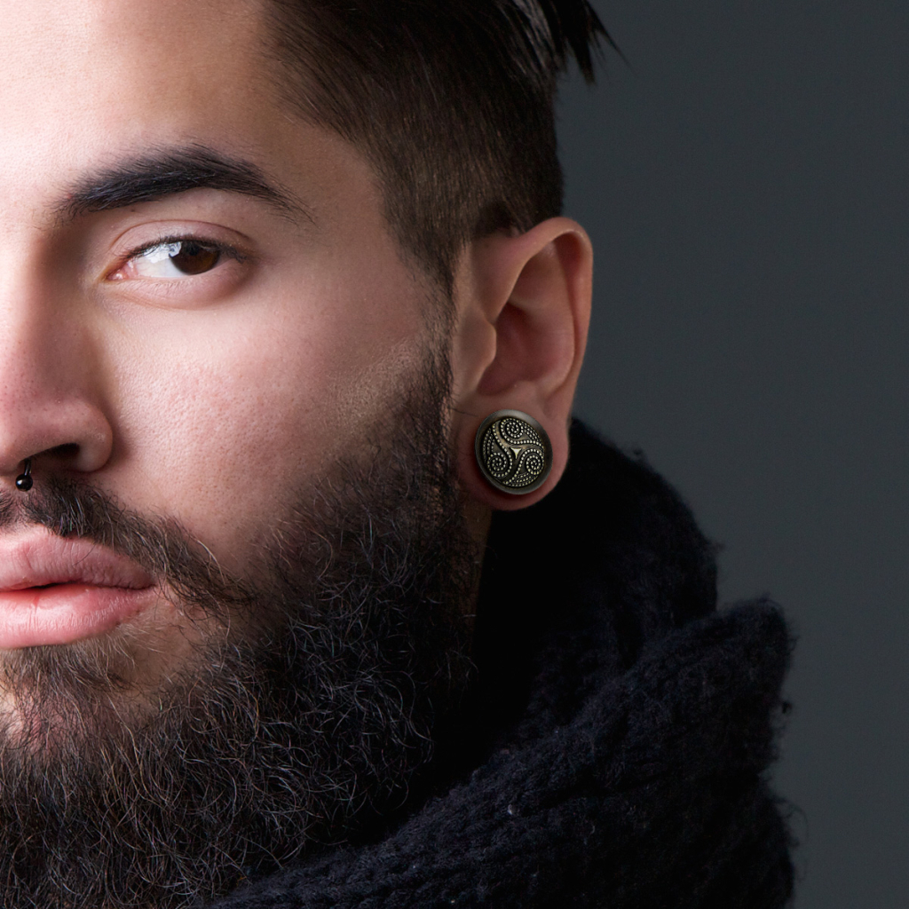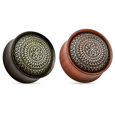 Plug realmente luxuoso, com uma quente cor vermelha da madeira de palissandro, ou em ébano escuro, que permitem que a sua dilatação possa transpirar. Este plug está decorado com o mais belo dos desenhos tribais, com o seu bonito desenho na parte frontal da joia, que sem dúvida dará um estilo sofisticado e diferente ao seu estilo. O seu bonito desenho com três espirais tem uma simetria em cada um dos pontos, e é feito numa placa de bronze, que contraste estupendamente com a cor da madeira.