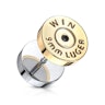 Aqui está um plug falso que se assemelha à tampa de um cartucho. Chamamos-lhe plug falso porque podes usá-lo num piercing normal, mais concretamente, um piercing com 1,2 mm. Não é possível notar diferenças entre este plug e um plug normal, assim que posto no lóbulo. O plug tem um diâmetro de 10 mm para poder incluir o texto, como se fosse um cartucho real. Caso contrário, não teria tanta piada!