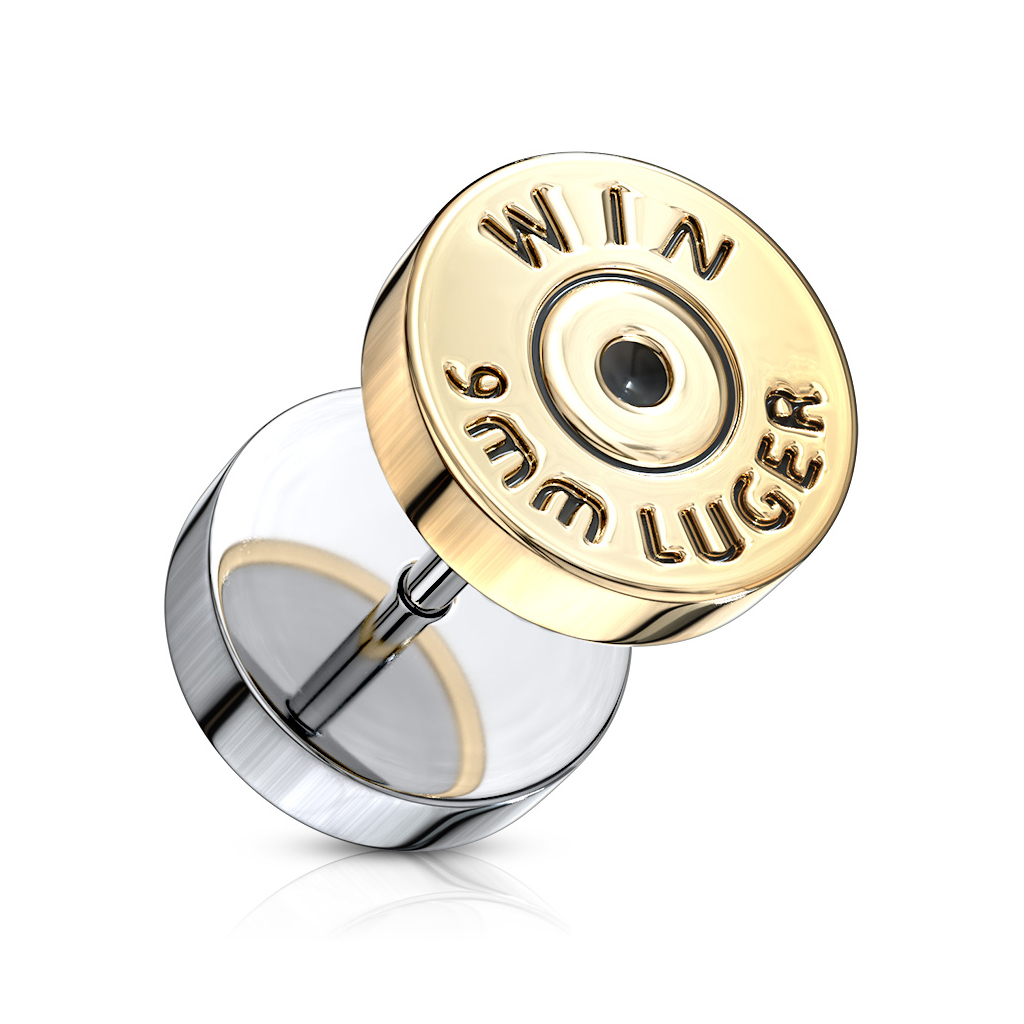 Aqui está um plug falso que se assemelha à tampa de um cartucho. Chamamos-lhe plug falso porque podes usá-lo num piercing normal, mais concretamente, um piercing com 1,2 mm. Não é possível notar diferenças entre este plug e um plug normal, assim que posto no lóbulo. O plug tem um diâmetro de 10 mm para poder incluir o texto, como se fosse um cartucho real. Caso contrário, não teria tanta piada!