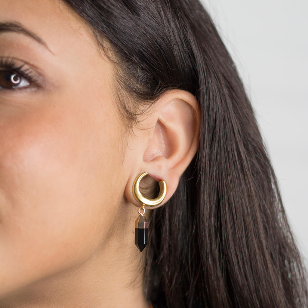 Se tens a orelha alargada, provavelmente conheces o problema de não poder usar jóias com pendentes. Mas com este saddle já podes, que realmente não pode ser classificado como um plug, túnel ou cone. É um tipo de jóia único. A joia é aberta na parte superior, onde as bordas são inclinadas para baixo, para envolver o lóbulo da orelha. Deverás ter um furo mínimo de 10 mm. na orelha para poder usar esta jóia. Por outro lado, não precisas de te limitar a 25 mm. Podes transportar facilmente o maior modelo de 25 mm. mesmo se o furo for superior a 25 mm. Como mencionado, existe um pendente neste modelo. Consiste numa haste em forma de prisma de resina preta.