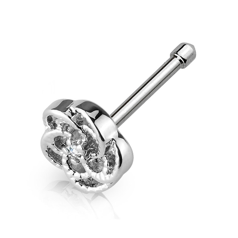 Esta bonita barra de nariz consiste de uma barra recta com uma linda rosa na frente. A rosa é muito detalhada com pétalas furadas e pequenas estruturas em forma de pequenas saliências nas bordas das pétalas. No meio da rosa encontra-se uma pequena pedra que combina muito bem com o design brilhante e espelhado da joia.