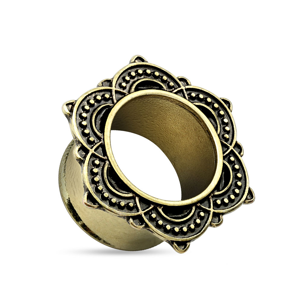 Se procura um túnel que seja distinto dos comuns e totalmente único, seguramente este túnel será do seu interesse. Esta joia é feita em aço cirúrgico, e foi submetida a um processo de banho de ouro especial para lhe atribuir este estilo de ouro antigo. A borda da parte frontal esta joia está decorada com uma bonita Rosa da Síria, feita em bronze.