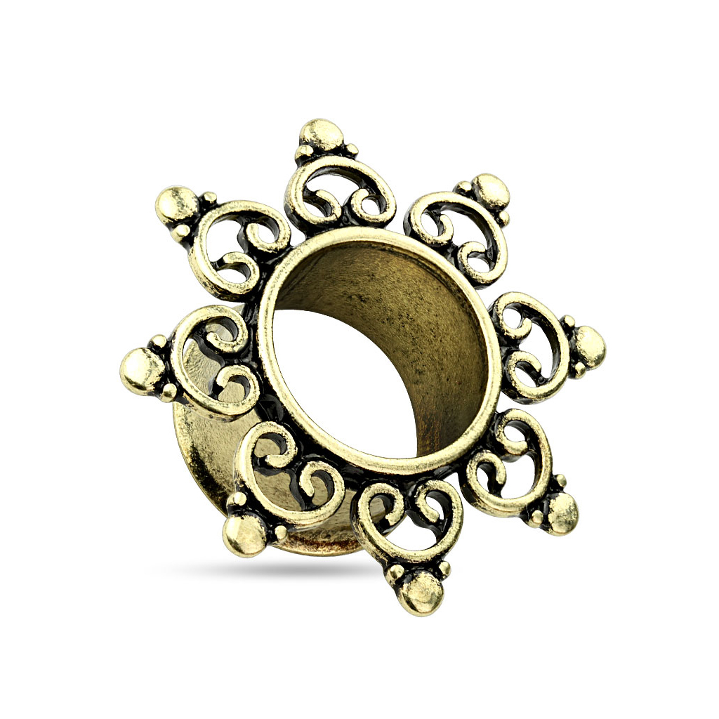 Esta é a sua oportunidade de conseguir um túnel com um desenho único. Este fabuloso túnel tem um precioso desenho tribal ao seu redor. Uma vez colocada, o tribal fica ao redor do túnel, e na frente do lóbulo da sua orelha, de forma a parecer um pequeno sol, com o furo da dilatação no centro.