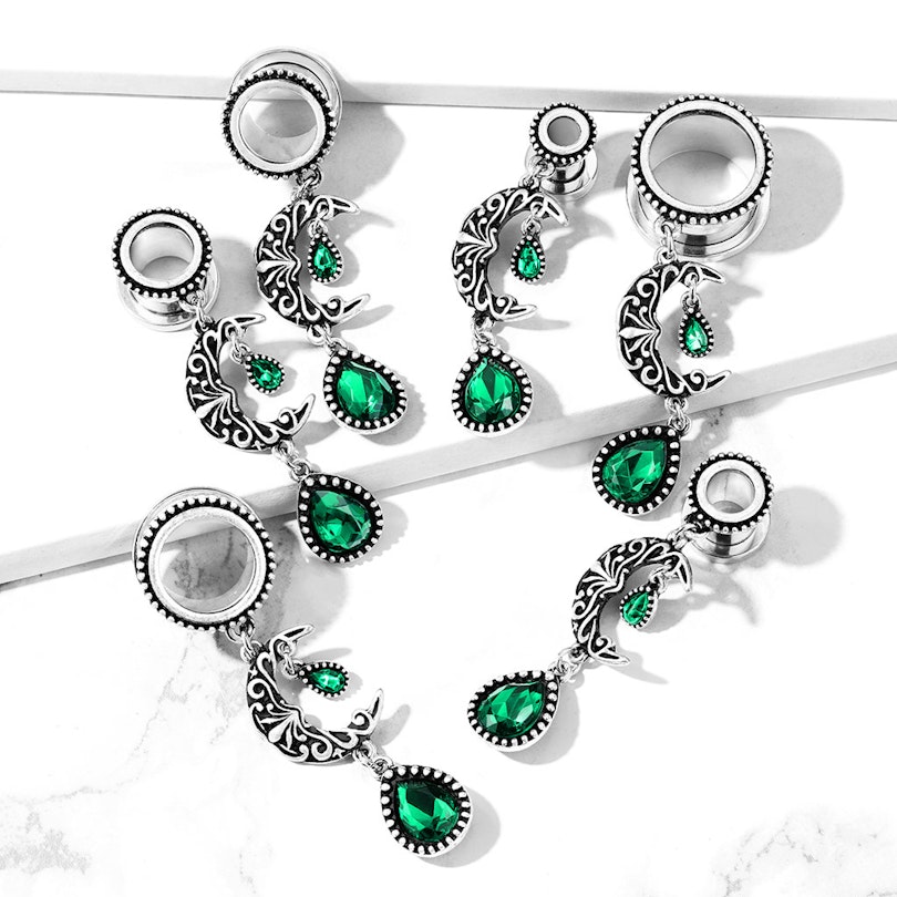 A grande maioria dos túneis consistem unicamente no anel em si - se tiver sorte, também há alguns elementos decorativos. Aqui neste modelo demos um longo passo e adicionamos um pendente mais longo à jóia. Pelo que o túnel deixa de ser o foco da atenção e passa a ser o seu pendente. Para encaixar no furo o túnel pode ser selecionado em vários tamanhos diferentes. Mas também é a única diferença entre os diferentes modelos. A lua e as pedras em forma de gota serão do mesmo tamanho, não importa o diâmetro que escolher. A Lua está decorada com filigrana - Ramos pequenos, peculiares e rijos que formam um padrão puro. Dentro do arco interno da lua fica a primeira pedra em forma de gota. Sob a lua fica o último. Como pode ver na foto, a pedra abaixo é maior que a outra. Por isso, alargou a sua orelha e gosta de jóias que dão nas vistas, então este túnel é definitivamente para si.