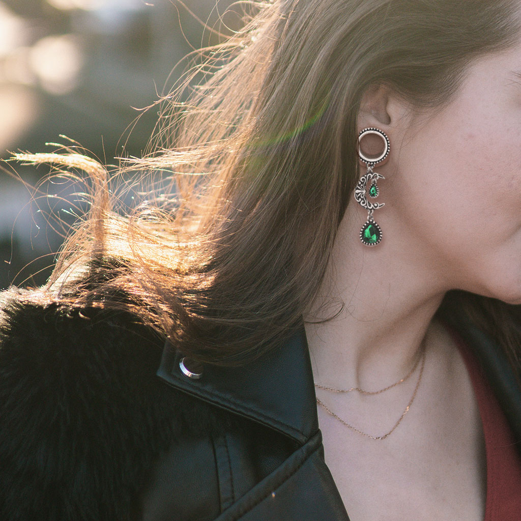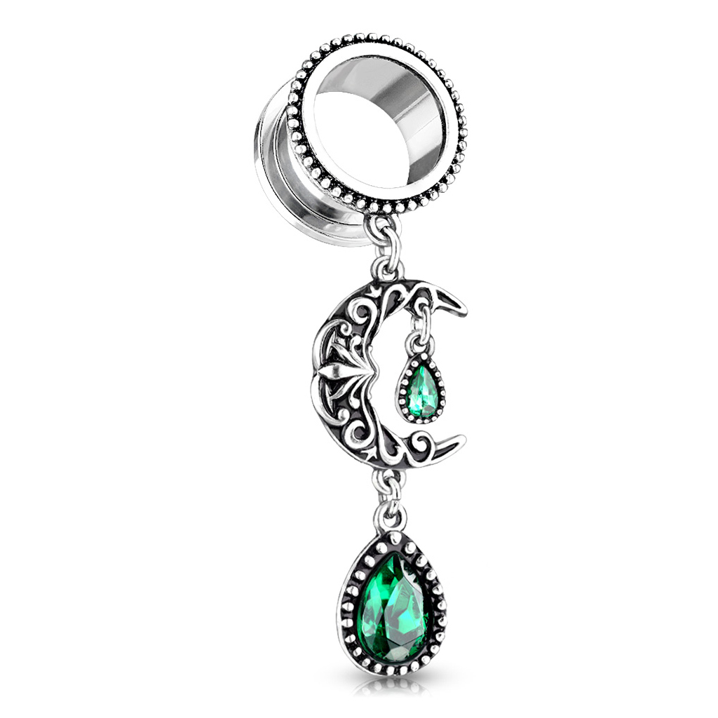 A grande maioria dos túneis consistem unicamente no anel em si - se tiver sorte, também há alguns elementos decorativos. Aqui neste modelo demos um longo passo e adicionamos um pendente mais longo à jóia. Pelo que o túnel deixa de ser o foco da atenção e passa a ser o seu pendente. Para encaixar no furo o túnel pode ser selecionado em vários tamanhos diferentes. Mas também é a única diferença entre os diferentes modelos. A lua e as pedras em forma de gota serão do mesmo tamanho, não importa o diâmetro que escolher. A Lua está decorada com filigrana - Ramos pequenos, peculiares e rijos que formam um padrão puro. Dentro do arco interno da lua fica a primeira pedra em forma de gota. Sob a lua fica o último. Como pode ver na foto, a pedra abaixo é maior que a outra. Por isso, alargou a sua orelha e gosta de jóias que dão nas vistas, então este túnel é definitivamente para si.
