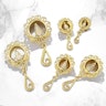 O túnel que vê acima está disponível em duas edições. Um modelo de cor prata e ouro brilhante. Estes são 100% idênticos, exceto pela cor. Ambos os modelos são fornecidos em seis tamanhos, variando de 6 a 16 mm. A gota e o modelo inteiro mudam proporcionalmente ao tamanho escolhido na própria joia. Na verdade, existem duas gotas nessa peça de joelharia - uma que fica pendurada livremente sob o túnel num pequeno anel e a que fica presa dentro do túnel, que também é a que possui incrustações de madrepérola. Ao redor do túnel, há uma grinalda de pequenos braços peculiares, que juntos formam um padrão de filigrana. O próprio túnel é feito de aço cirúrgico, onde a extremidade traseira pode ser desaparafusada para facilitar a inserção e remoção das jóias. A linha fica no interior, tornando-a leve e direta. A frente é feita de latão, que tem a mesma cor do resto das jóias.