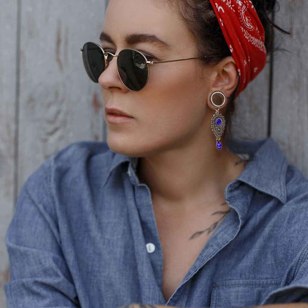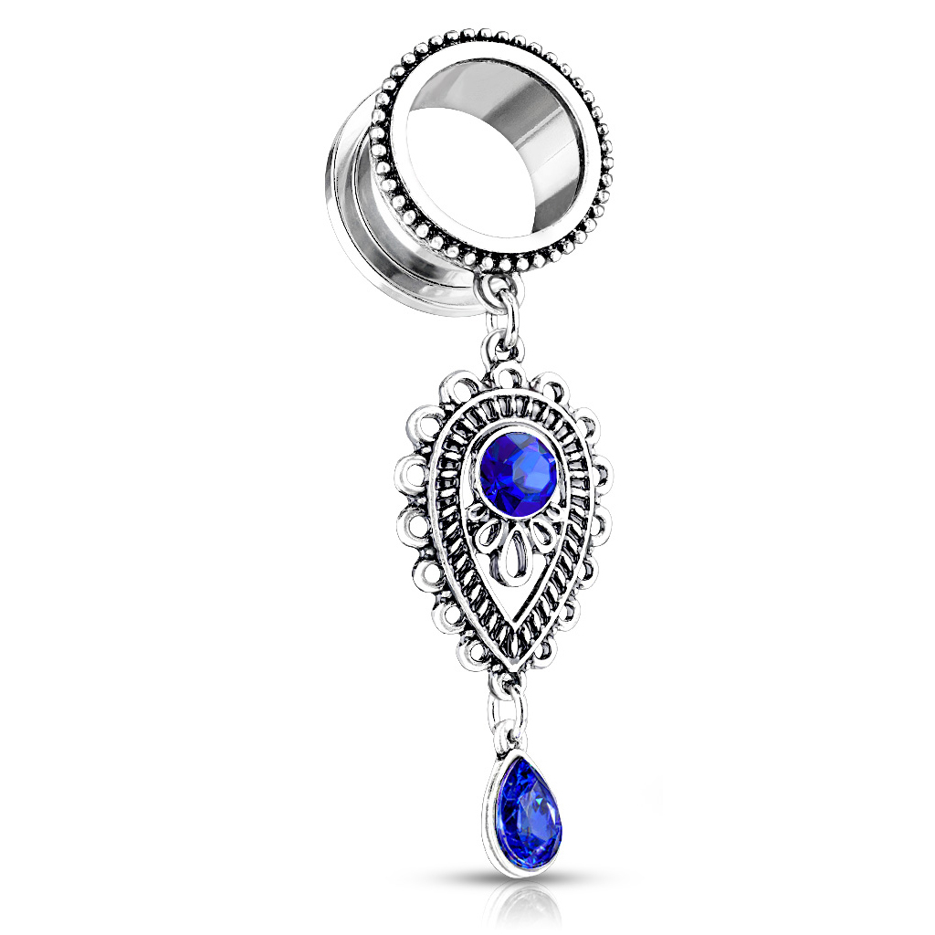 Pode usar este túnel se tiver um orifício na orelha entre 6 e 16 mm. Ambos os tamanhos incluídos. O túnel é feito de aço cirúrgico e possui uma conta de latão na frente. O pendente também é feito de latão. O pendente consiste numa formação reversa em forma de gota de arcos e outros padrões detalhados. No meio há uma bela pedra azul da qual emergem pequenos arcos de gotículas - quase como assistir ao pôr do sol no mar. Sob o grande pendente em forma de gota, está pendurada outra pedra. A pedra também tem formato de gota e tem a mesma cor que a outra pedra. Na parte de trás do túnel estão as fechaduras. O fecho é um disco grande que desaparafusa para poder colocar facilmente as jóias na orelha e retirá-las com facilidade.