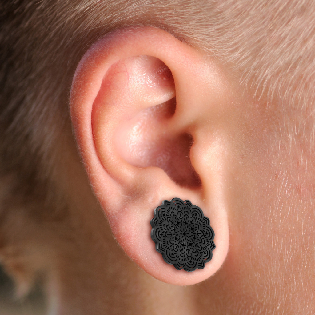 Nessa joia você terá os mais lindos detalhes na mandala e a opção de cores diferentes que acrescenta uma certa elegância ao design. Quando a joia está na orelha, a mandala será a única coisa que poderá ser vista pela frente. O resto da joia é feita de aço cirúrgico e a parte traseira é equipada com uma rosca que pode ser retirada para facilitar a aplicação da joia.