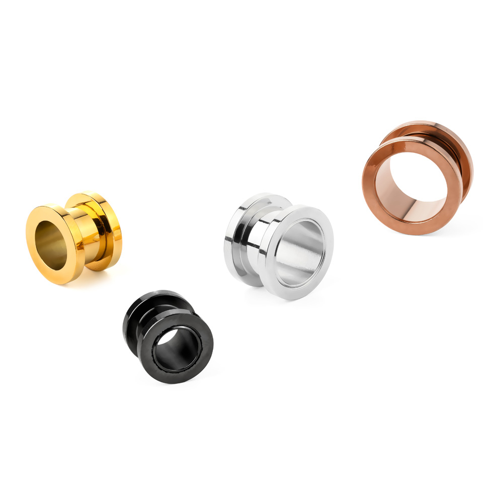 Esse lindo túnel é feito de aço cirúrgico e está disponível em quatro linda cores. O modelo brilhante é de aço cirúrgico puro enquanto os outros têm diferentes tipos de revestimento, que dá suas respectivas cores. Por exemplo o modelo dourado é revestido com uma grossa camada de ouro 14 quilates. No entanto, note que a cor roxa pode ter tons de amarelo na mesma.