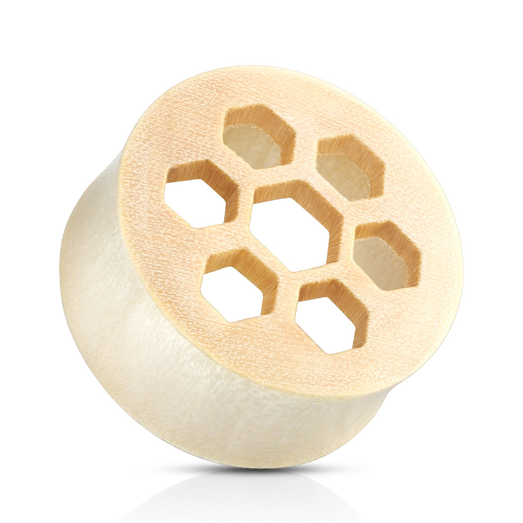 O túnel é decorado com um design hexagonal a céu aberto - pode facilmente lembrar-lhe de um favo de mel! Tenha em mente que este túnel não é feito para iniciantes em dilatações. Os tamanhos disponíveis começam em 10 mm e até 25 mm de diâmetro.