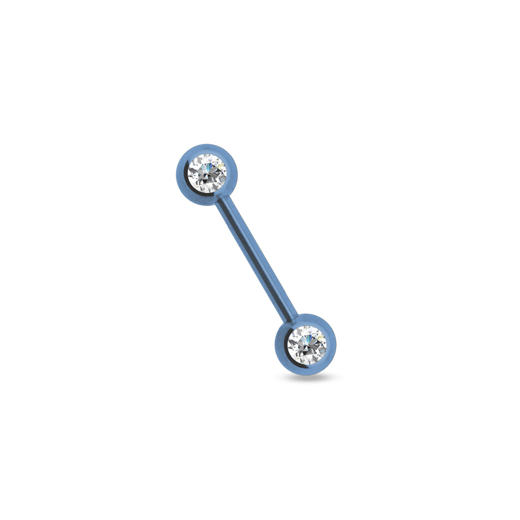 Esta joia tem nas suas extremidades duas bolas grandes de 6 mm. Não se trata precisamente de joias discretas, mas que atraem muito a atenção de quem as veja. Além das cores das barras, as bolas estão decoradas com brilhantes transparentes. Os brilhantes têm formas redonda e estão talhados como os diamantes, pelo que brilhante muito em quanto a luz se reflita nos mesmos.