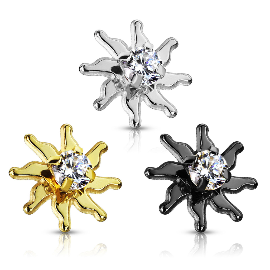 Pode colocar esta joia micro dermal se já tem uma base de piercing micro dermal na sua pele. Esta parte superior enrosca-se facilmente na sua base para piercing, e mostrará um bonito sol sobre a sua pele. O sol tem 8 pontas onduladas que nos relembra os desenhos tribais. No centro encontra também uma pequena zirconia de 2,5 mm. Esta está bem fixa à joia por meio de pequenos pontos que asseguram que esta não se possa mover. Este sol está disponível em três cores distintas, escolha a que mais gostar: prateado, preto ou dourado. Qualquer que seja a cor que escolher, a zirconia da joia será sempre transparente. A única diferença entre cada uma das joias é a cor do sol, pelo que de resto são idênticas.