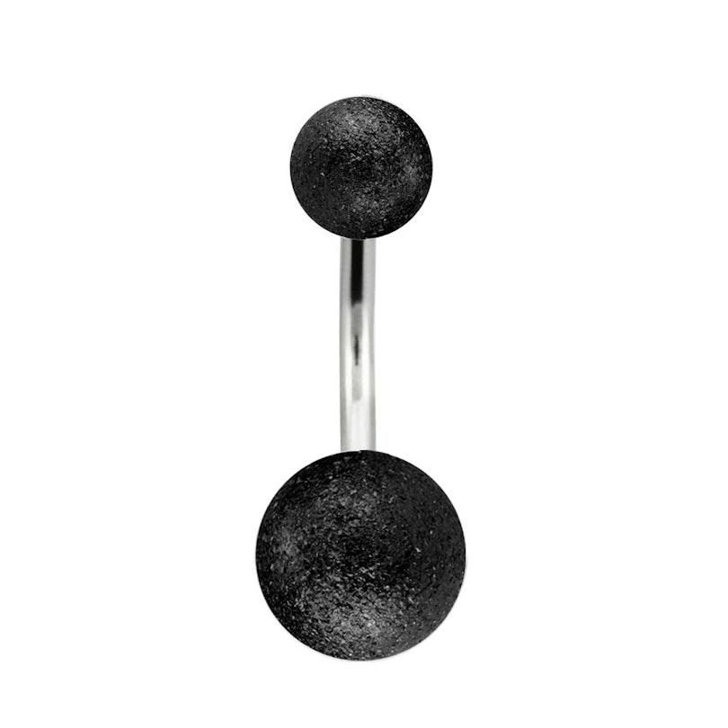 Este piercing para o umbigo brilha assim que alguma luz reflete nas suas bonitas bolas. A superfície das bolas é feita de aço cirúrgico e tem uma textura rugosa, graças ao revestimento especial que recebeu, através de um processo químico, para colar pequenas partículas brilhantes.