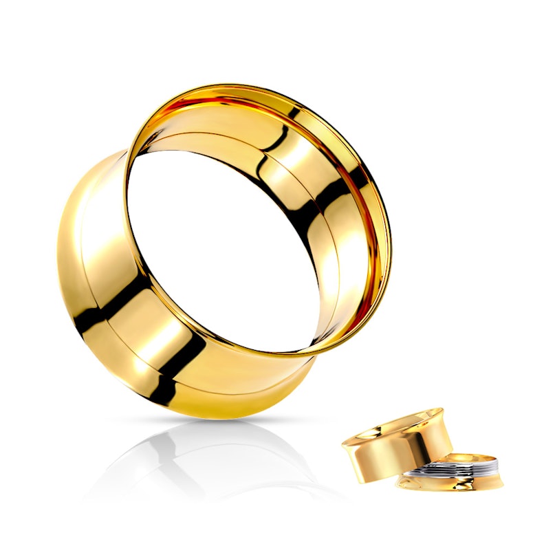 Lindo e simples túnel em um estilo elegante para você que deseja manter um visual simples de design clássico para seu alargamento. Esse lindo túnel é fito de aço cirúrgico tingido. Aço cirúrgico é muito usado para jóias de piercing, e aqui você o encontra encontra em uma edição luxuosa revestido de ouro.