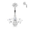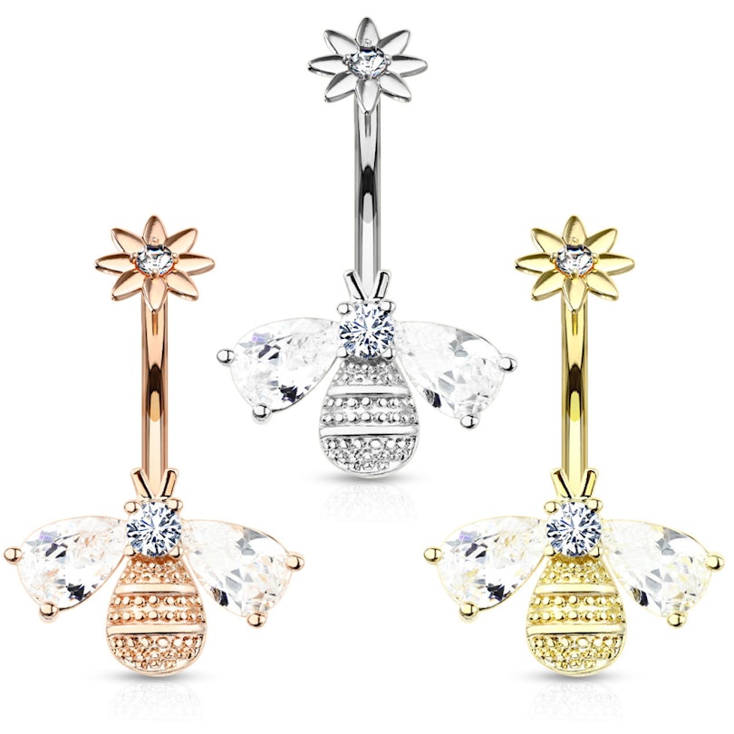 Um piercing no umbigo nem sempre precisa consistir numa bola superior redonda regular e uma bola inferior ligeiramente maior. Pode, como neste caso, ser um pouco mais criativo e criar algo extra com o design. A parte superior não só possui uma rosca interna, como também é equipada com uma bola de fecho em forma de flor com uma pequena pedra no centro. A flor é desaparafusada da barra com 10 mm de comprimento, onde no final há uma pequena abelha com algumas belas asas de pedra. A cabeça da abelha também é feita de pedra. O corpo da abelha leve tem alguns pequenos detalhes com visual geral mais realista. Pode escolher este modelo em três cores diferentes. Tudo é idêntico, é apenas a cor do metal que faz a diferença. Agora que falamos no metal, devemos mencionar que a barra é obviamente feita de aço cirúrgico. Somente a abelha é feita de latão.