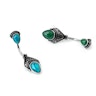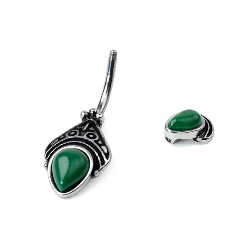O piercing para o umbigo aqui apresentado chamará a atenção de todos com o seu desenho original. A joia é feita em aço cirúrgico e o desenho na parte superior e inferior da barra em bronze. As partes de bronze foram cobertas com prata envelhecida, atribuindo-lhe assim a sua cor escura. O bronze é um material maleável, pelo que foi também possível fazer um bonito desenho de filigrana que se pode ver sobre as pedras que se encontram em ambas extremidades da joia.