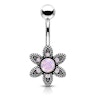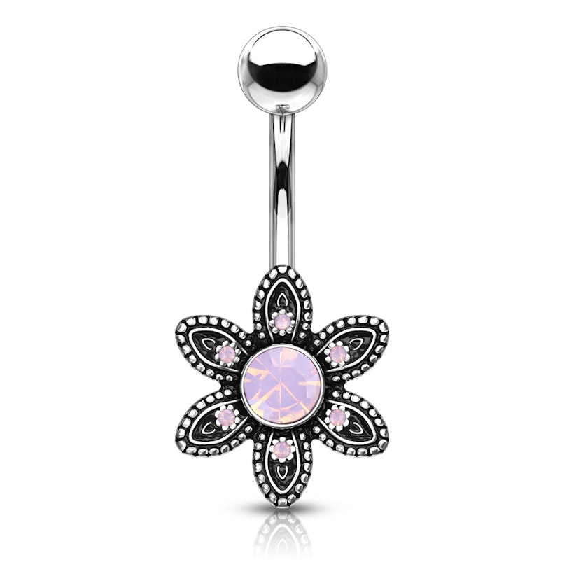As opalas que vê na imagem são pedras sintéticas. No entanto, isto não altera a beleza das pedras, já que, na verdade não notará a diferença. Nesta joia existem 7 opalas: uma pequena em cada uma das seis pétalas da flor, e uma maior no centro. Todas as pedras são redondas e rosas. As pequenas estão fixas a flor inferior com pequenos fixadores de bronze, e a peça maior está fixa no meio da flor, rodeada por um anel de bronze.