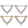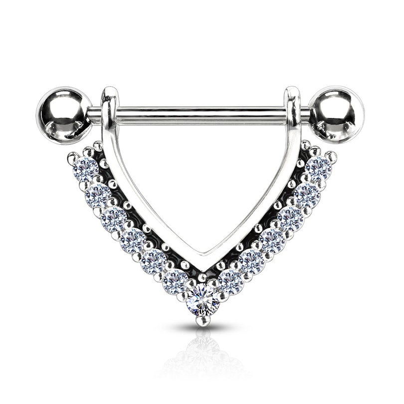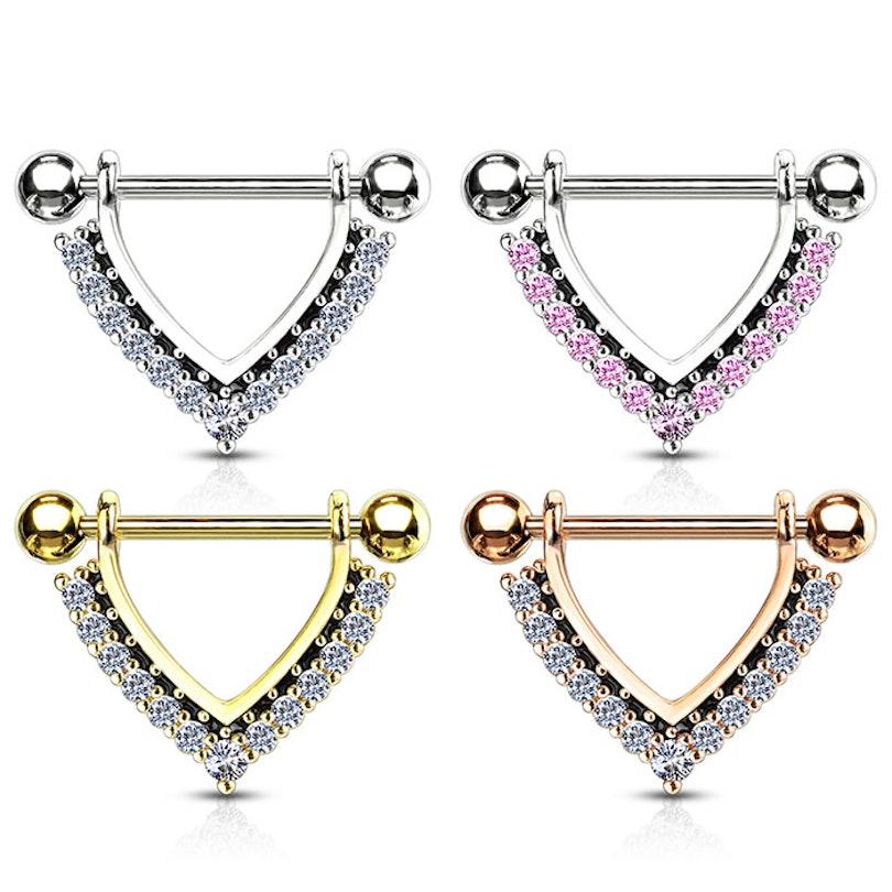 Gosta de decorar os seus mamilo com brilhantes atractivos para ainda assim, delicados? Então não procure mais. Este escudo para o mamilo traz 13 brilhantes no total: 6 de cada lado do "triângulo", e um grande no ângulo inferior. Estes brilhantes podem ser da cor que quiser; qualquer opção ficará muito bem com a cor da estrutura joia, que pode também escolher.