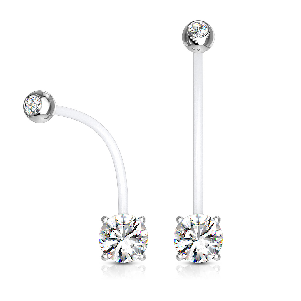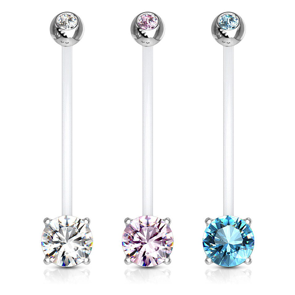Agora é possível manter o seu piercing do umbigo mesmo durante a gravidez. Se não o quer retira, temos a solução perfeita! Esta joia para o umbigo é feita de um material plástico macio chamado PTFE, que por sua vez, é muito flexível. Isto significa que pode acompanhar os movimentos do seu corpo e adaptar-se à sua barriga em crescimento durante a gravidez.